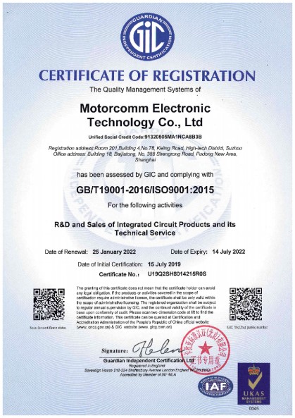 On July 15, 2019, Motorcomm passed the GB/T19001-2016/ISO9001:2015 certification for integrated circuit product R&D, sales and technical services, and obtained the international standard certification.