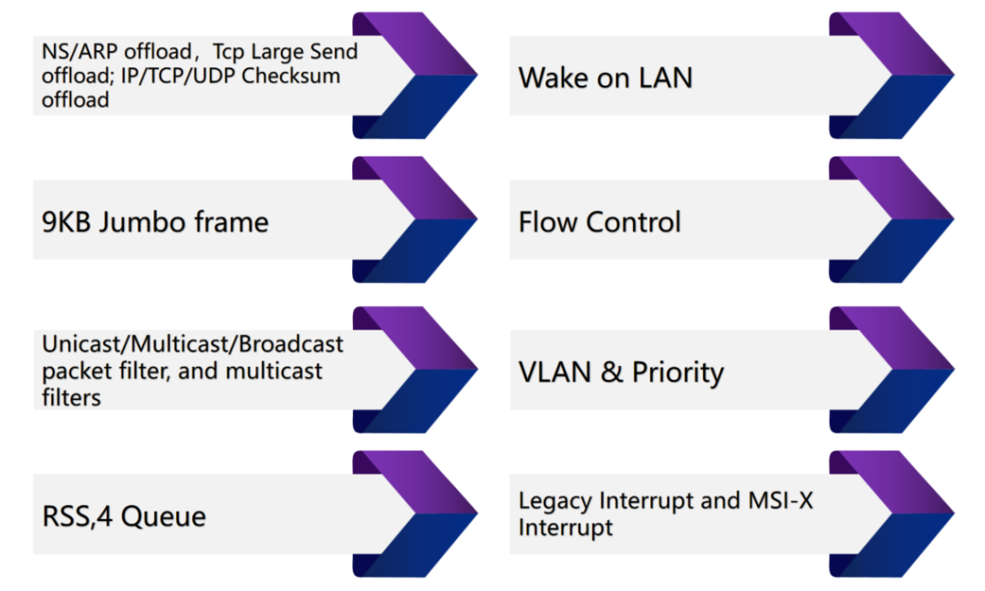 This series support 10/100/1000Mbps Ethernet rate, with PCIE1.1 interface, and are compatible with Windows, Linux and other operating systems, including X86 Windows 10 and later (Microsoft WHLK certified), X86 Linux, X86 UEFI PXE, ARM64 Linux, and ARM64 UEFI PXE.